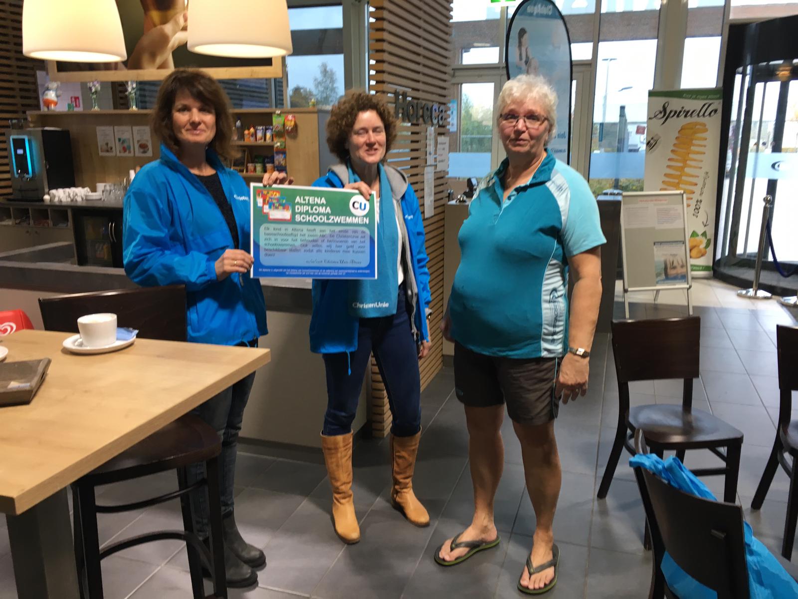Zaterdagmiddag was daarom Aqua Altena het decor van het symbolisch uitreiken van het diploma door ChristenUnie kandidaten Caroline van Tilborg-Kant en Hennie Schermers-van Elderen aan zwemdocente Erica.