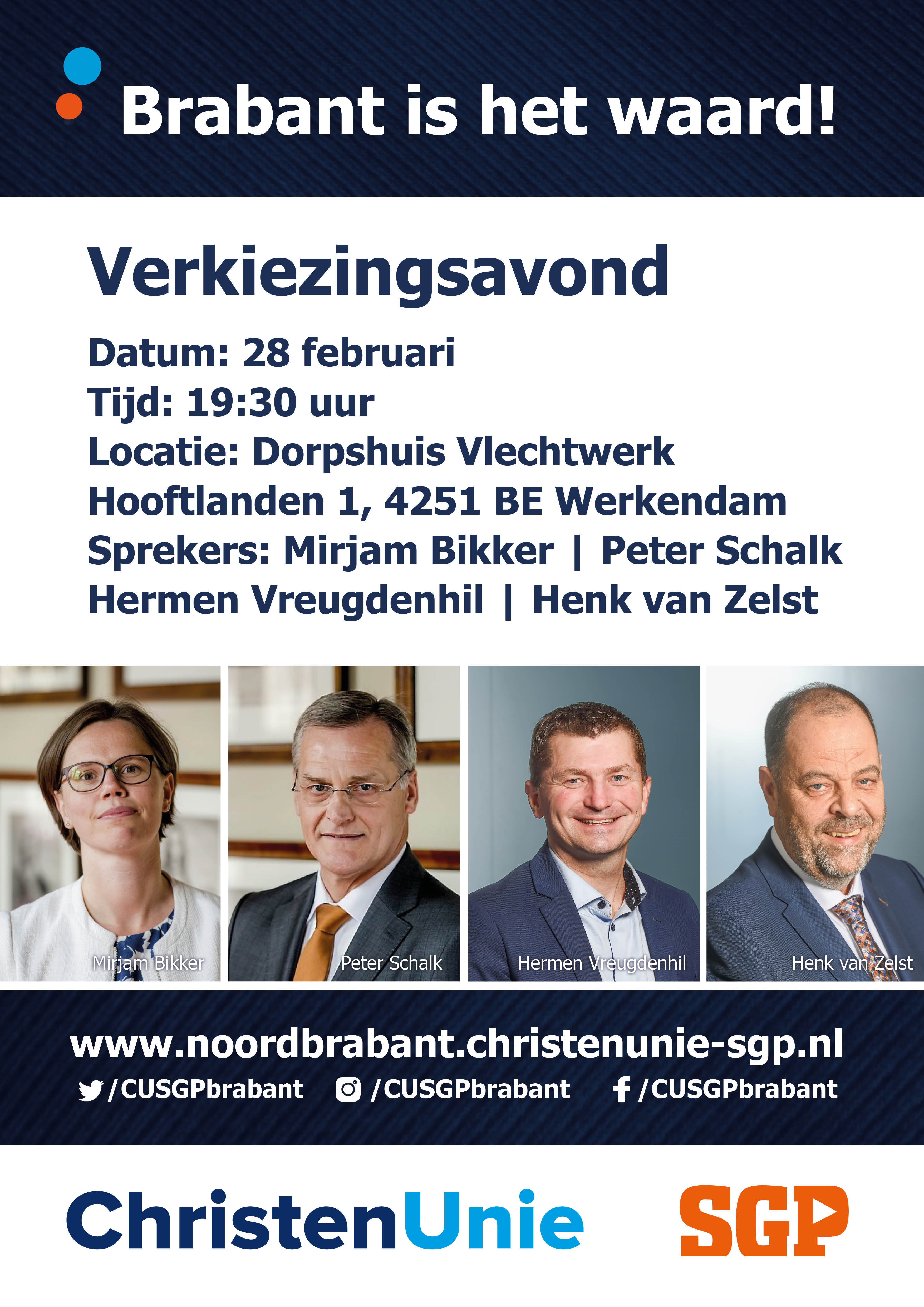 Op 20 maart worden de provinciale statenverkiezingen gehouden. ChristenUnie en SGP doen in Noord-Brabant met een gezamenlijke lijst mee aan deze verkiezingen en organiseren een interactieve verkiezingsavond. Speciale gasten zijn de landelijke politici Mirjam Bikker en Peter Schalk.